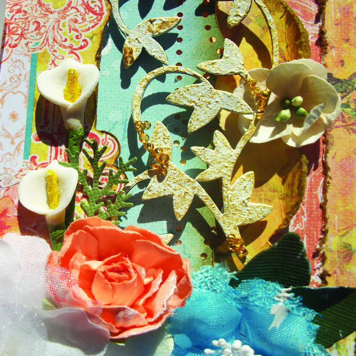 I distressed and inked all my layers. I also used Martha Stewart "Cherish" and "Vintage Floral" border punches on a couple of layers. There's also some masking with a Prima's "Poppies and Peonies" mask and gesso on the background and some layers. The flowers are a mixture of Manor House, Prima, and some I've had in my stash.