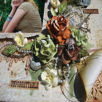 I did some masking on the background with the ledger mask by CW and Shimmerz texturez in Patina. And just a bit of masking with Tim Holtz Vintage Photo ink and the tiny tiles mask by CW. I inked the edges of the background with the Vintage photo, then randomly went over it with a little gold Rub and Buff. Then using the TH ink and a few of my postage stamps I went around the edges and on my layers. I whitewashed the background and through my clusters with some gesso to blend it all in. I dyed my laces with some tea to age them a bit. There's a few drips and splatters of Tattered Angels in English Ivy and Creme de Chocolate. The pretty green flowers are by Kaisercraft, and the rest are from my stash. I even added a few twigs from my apple trees for the Scrap for help June challenge.